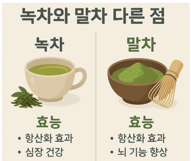 이렇게 녹차와 말차 다른 점을 효능에서 보자면, 녹차는 ‘지속적이고 은은한 건강 효과’, 말차는 ‘짧고 강한 집중력·에너지 부스팅’으로 요약됩니다.