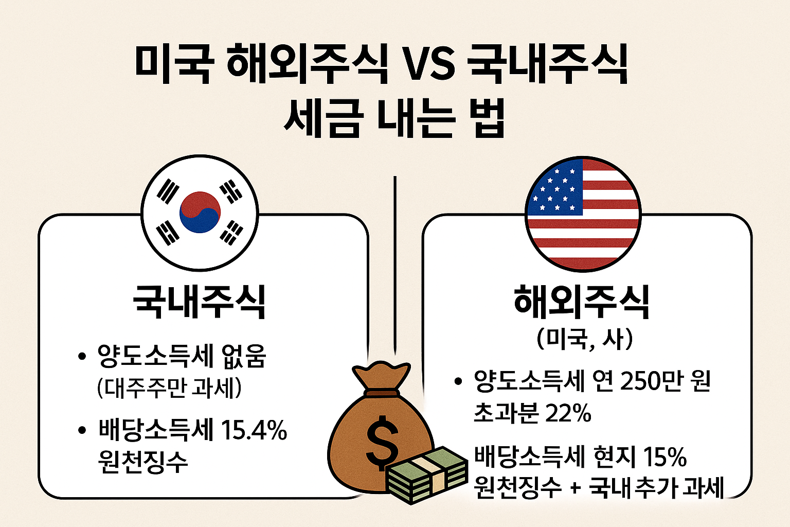 같은 주식 투자지만 국내주식과 해외주식(미국 포함)은 과세 기준과 방식이 크게 다릅니다.